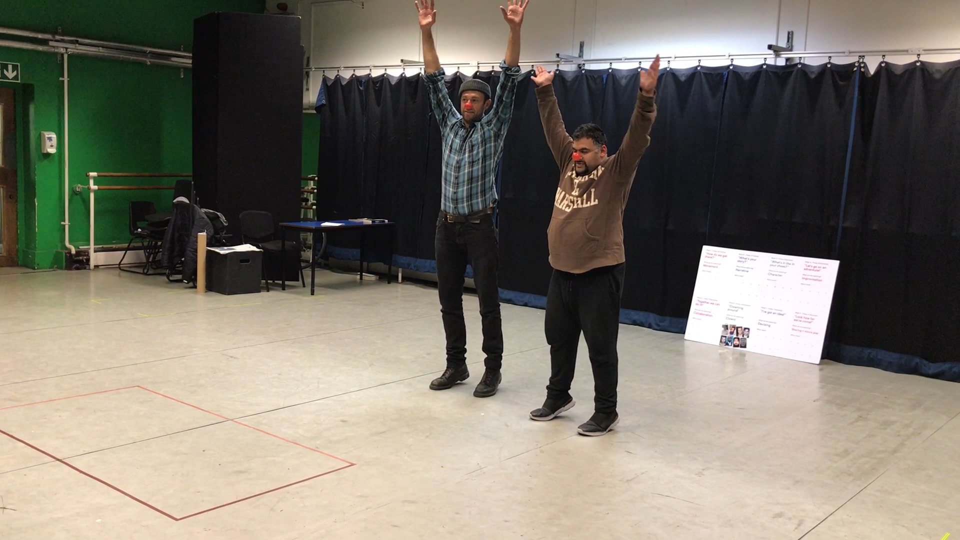 Today we explored Clown. We each put on a red nose. The red nose becomes a tiny neutral mask of our clown. We play a game of hot and cold with the audience. Silence is golden.